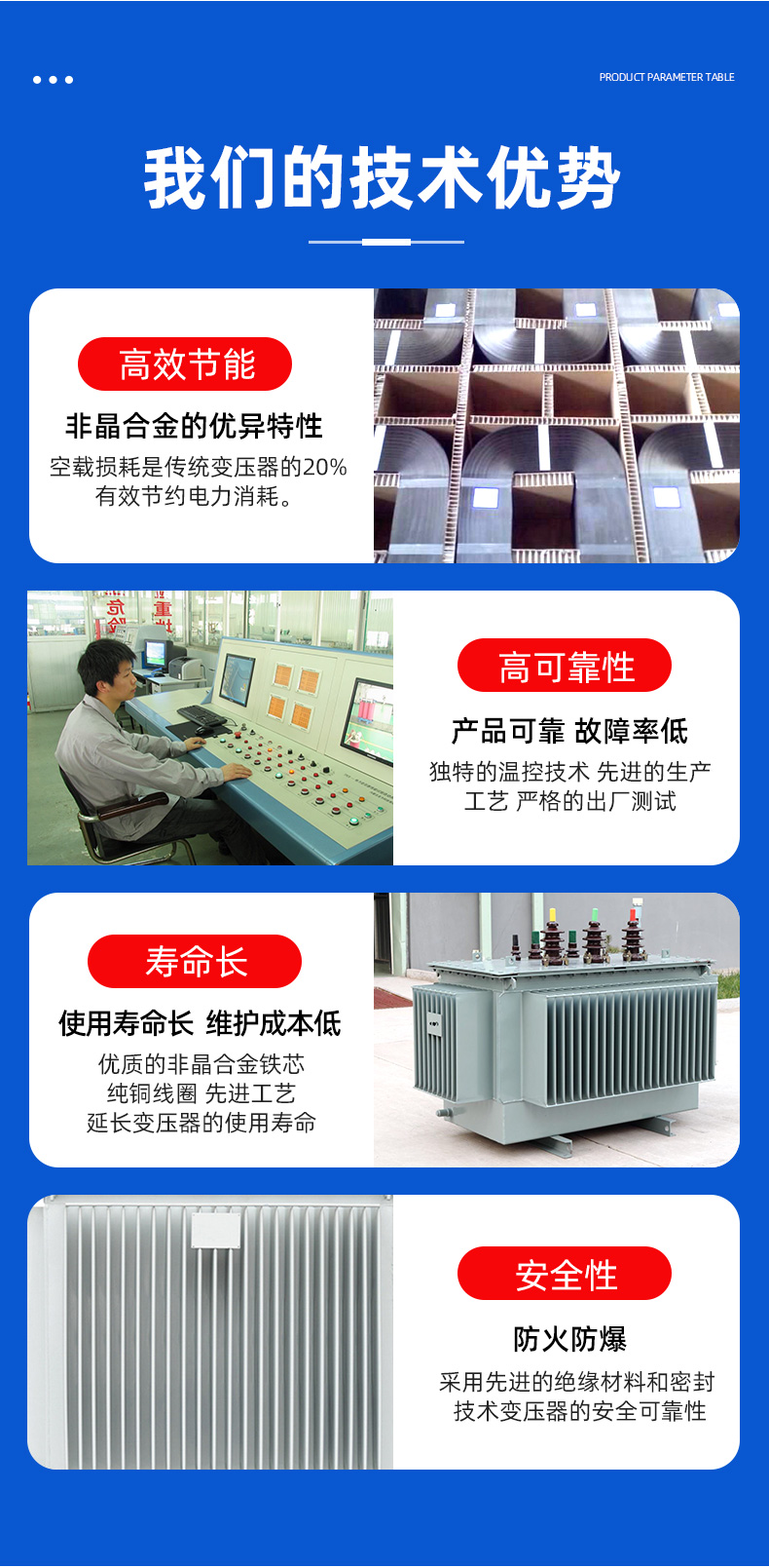 該變壓器的鐵芯采用非晶合金材料,相比傳統(tǒng)的硅鋼片材料,其磁導(dǎo)率高,鐵損耗低,磁飽和感低,從而使得變壓器的效率得到了進一步提高。另外,非晶合金材料在加工時可以制成形狀各異的薄帶狀材料,鐵芯損耗低,結(jié)構(gòu)緊湊,提高了變壓器的功率密度,進一步減小了變壓器的體積和重量。